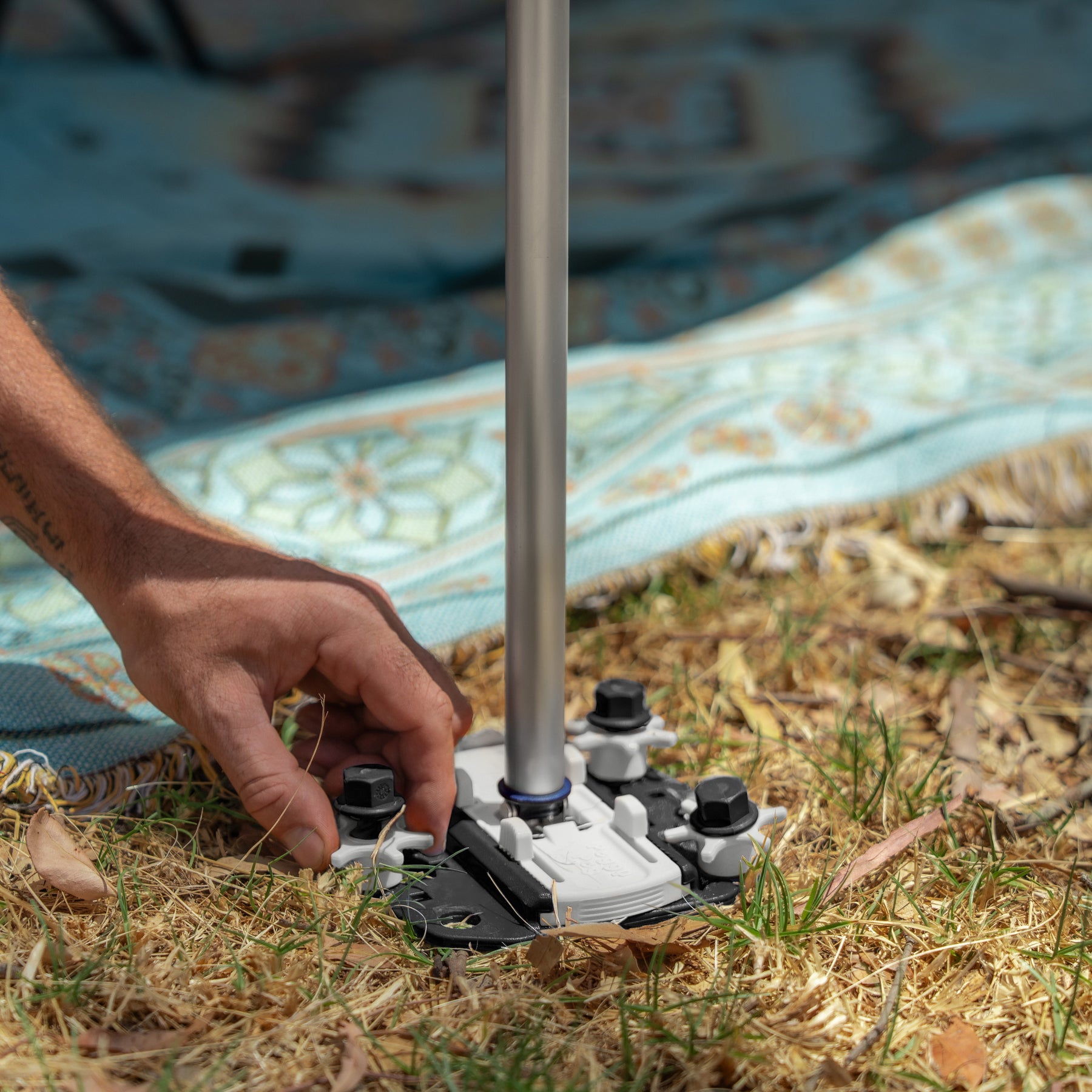 For awnings, tent poles or guy ropes of all kinds. Awn-foot supports or tent frames are securely fixed between the Fix&Go anchor plates and cannot sink into soft ground or lift off. The height-adjustable lock nut of the screw system secures the plate even if the peg cannot be fully screwed in. Retracting awnings is possible as often as you like, simply by sliding open the sliders. Screw pegs sorted for all ground conditions. (Pre-drilling can be useful, especially in winter). When it's time to leave, just unscrew — it's that simple!